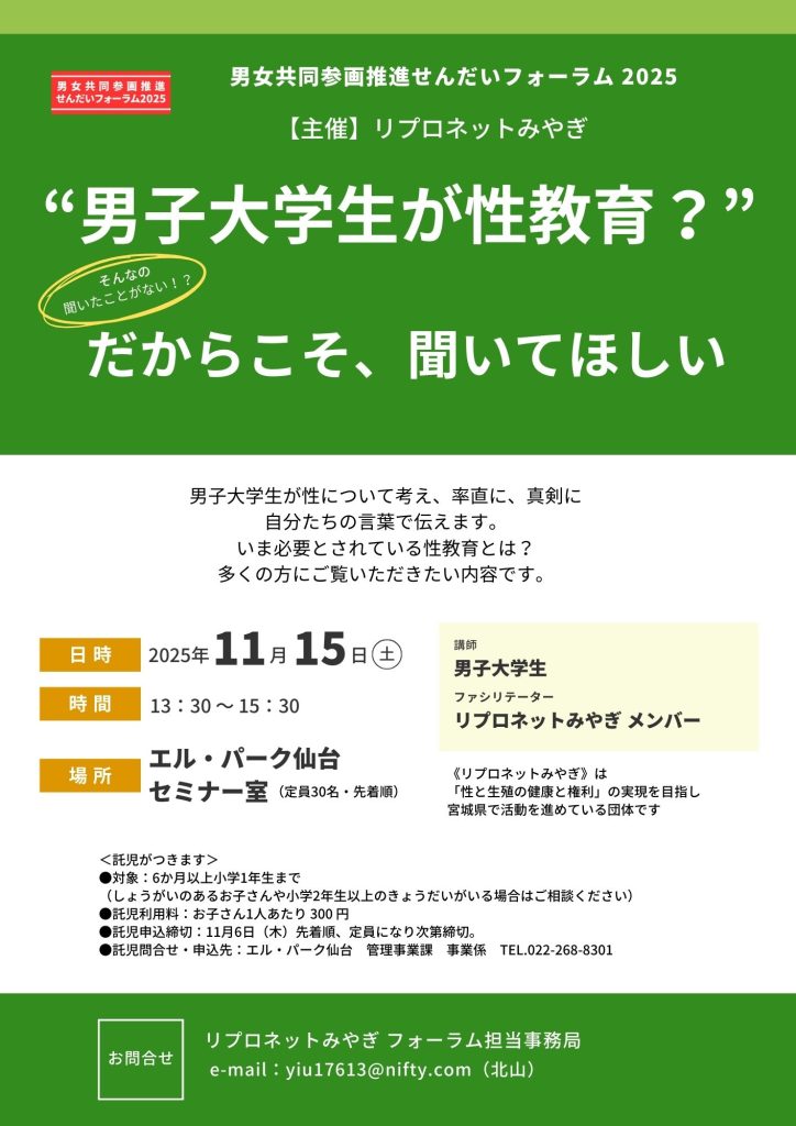 2025年11月7日 / 最終更新日時 : 2025年11月7日 kitayama kiyoshi イベント案内 《リプロネットみやぎ “男子大学生が性教育?” だからこそ、聞いてほしい》 【男女共同参画推進せんだいフォーラム2025】いよいよ来週に迫ってきました。私が関わるイベントをお知らせします。 《リプロネットみやぎ “男子大学生が性教育?” だからこそ、聞いてほしい》11月15日(土曜日)13時30分から15時30分エル・パーク仙台5階 セミナー室 男子大学生が性について考え、率直に、真剣に、自分たちの言葉で伝えます。いま必要とされている性教育とは?多くの方に参加いただきたい内容です。 予約不要・参加無料 \ 最新情報をチェック / FacebookXBlueskyHatenaCopy