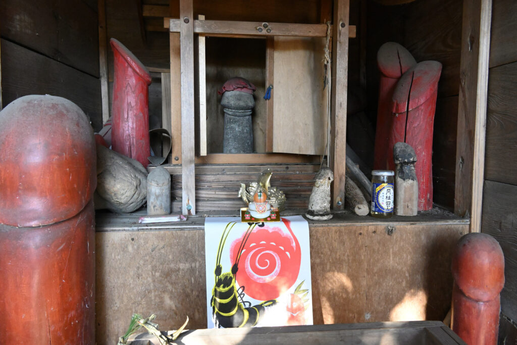 周囲にも大小さまざまな男根様が供えられ、形や大きさ、色も実に多様で、ひときわ大きなものには赤く彩色が施されていました。