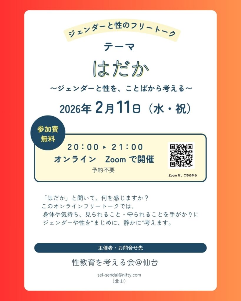 このオンラインフリートークでは、「裸=性的な話」をする場ではなく、ジェンダーや性をめぐる“感覚”や“社会のあり方”を、言葉にして考える時間をつくります。